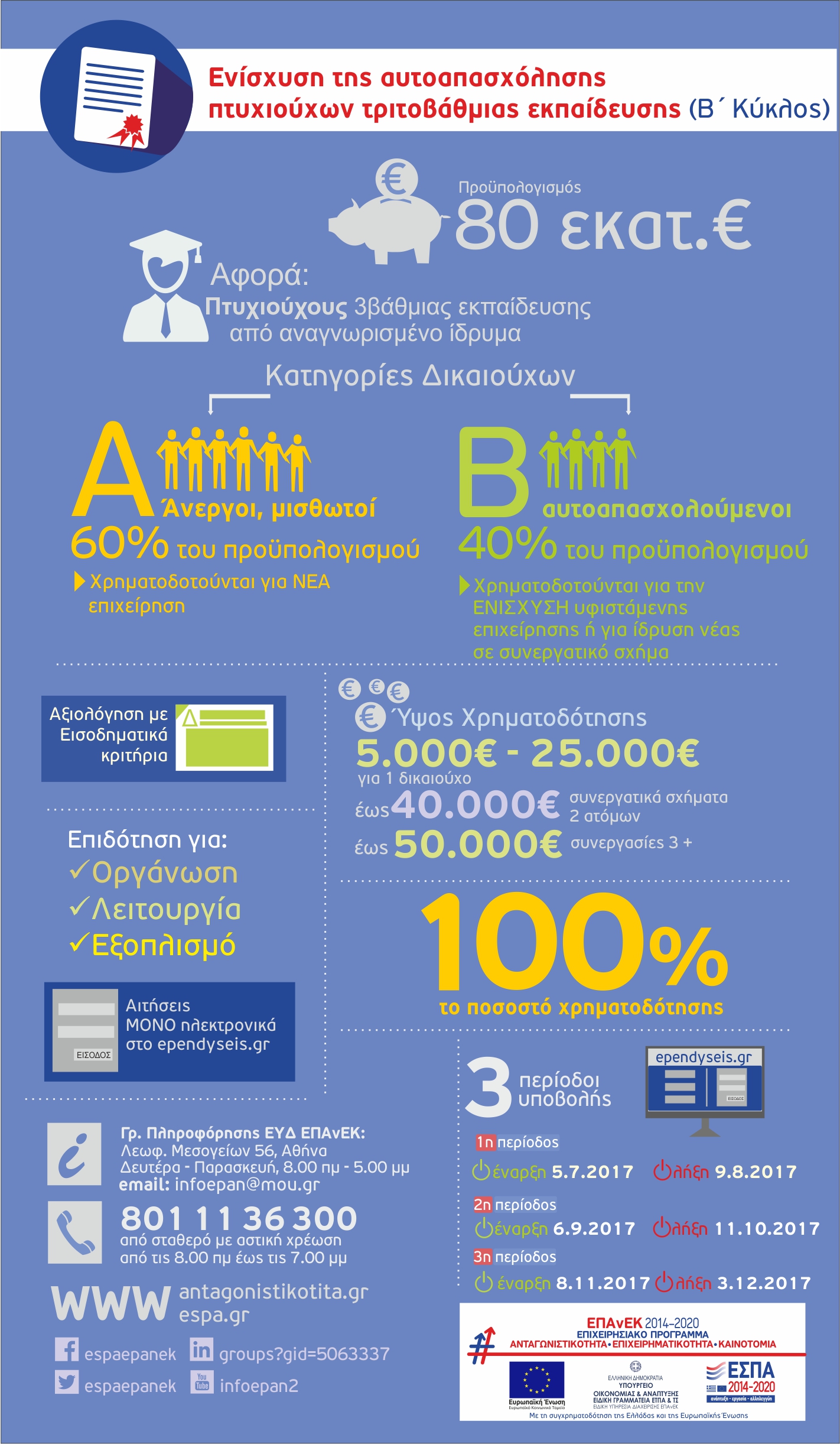 Το πρόγραμμα στοχεύει στην υποστήριξη πτυχιούχων τριτοβάθμιας εκπαίδευσης, ανέργων, μισθωτών και αυτοαπασχολούμενων, για την έναρξη/υποστήριξη της άσκησης επαγγελματικής δραστηριότητας συναφούς με την ειδικότητά τους σε αυτοτελή επαγγελματικό χώρο. Επιδίωξη του προγράμματος είναι η ενίσχυση της αυτοαπασχόλησης των πτυχιούχων και η δημιουργία νέων θέσεων εργασίας. Δικαιούχοι της δράσης είναι: Απόφοιτοι ΑΕΙ/ΤΕΙ ή ισότιμης σχολής Ελλάδος ή εξωτερικού (αναγνωρισμένη από το ΔΟΑΤΑΠ) ή κάτοχοι αναγνώρισης επαγγελματικών προσόντων, από ΣΑΕΙ ή ΣΑΕΠ. Επίσης, πτυχία από Σχολές Θεάτρου και Χορού αναγνωρισμένες από το Υπ. Πολιτισμού ως τριτοβάθμιες και απόφοιτοι μουσικών εκπαιδευτηρίων αναγνωρισμένων από το Κράτος (το πρώτο πτυχίο θα πρέπει να έχει αποκτηθεί μετά την 1/1/1995). Μπορούν να συμμετέχουν: Κατηγορία Δικαιούχων Α: Ανεργοι, εγγεγραμμένοι στα μητρώα ανέργων του ΟΑΕΔ , μισθωτοί (πλήρους ή μερικής ή εποχιακής απασχόλησης), υφιστάμενοι επιχειρηματίες που θα συστήσουν νέα εταιρία με ανέργους ή μισθωτούς. Κατηγορία Δικαιούχων Β: Υφιστάμενοι ατομικοί επιχειρηματίες (αυτοαπασχολούμενοι) που ασκούν ήδη συναφή με την ειδικότητά τους (τίτλο σπουδών) επαγγελματική δραστηριότητα, όπως επίσης και συνεργασίες μεταξύ αυτών. Επιδοτούνται για: τη δημιουργία, οργάνωση, υποστήριξη και λειτουργία νέας ή υφιστάμενης επιχείρησης συναφούς με τις σπουδές τους. Επιδοτούνται με: 5.000 ευρώ έως 25.000 ευρώ για ένα δικαιούχο με ατομική επιχείρηση, έως 40.000 ευρώ συνεργατικά σχήματα δύο ατόμων, έως 50.000 ευρώ για συνεργασίες τριών ή περισσοτέρων. Χρηματοδοτείται το 100% των επιλέξιμων δαπανών. Βασικές προϋποθέσεις συμμετοχής: I. Εισοδηματικά κριτήρια Για τους ενδιαφερόμενους που θα υποβάλλουν αίτηση με την ιδιότητα του ανέργου ή μισθωτού ισχύουν τα εξής: Για την κατηγορία Α, ο μέσος όρος του εισοδήματος επιβολής εισφοράς για τα φορολογικά έτη 2015, 2014 & 2013, να μην υπερβαίνει ανάλογα με την οικογενειακή τους κατάσταση κατά το φορολογικό έτος 2015 τις 22.000 ευρώ για το ατομικό εισόδημα ή τις 35.000 ευρώ για το οικογενειακό εισόδημα. Για την κατηγορία Β, ισχύουν όσα αναφέρονται παραπάνω καθώς επίσης θα πρέπει και o μέσος όρος του συνόλου των ακαθαρίστων εσόδων από επιχειρηματική δραστηριότητα για τα έτη 2015, 2014 & 2013 να μην υπερβαίνει τις 40.000 ευρώ. II. Επιδότηση από προγράμματα στο παρελθόν Ο ενδιαφερόμενος να μην έχει ενταχθεί σε συγχρηματοδοτούμενα προγράμματα με την ιδιότητα του ατομικού επιχειρηματία/επιτηδευματία ή του εταίρου σε επιχορηγούμενη εταιρεία, από την 1/1/2013, πλην προγραμμάτων κατάρτισης. ΙΙΙ. Να μην συμμετέχουν με την ιδιότητα του εταίρου/μετόχου σε άλλες επιχειρήσεις οποιασδήποτε νομικής μορφής από την 1/1/2015, εξαιρείται η κατοχή μετοχών εταιρειών εισηγμένων στο Χρηματιστήριο. IV. Να μην έχουν και την ιδιότητα του ατομικού επιχειρηματία κατά την υποβολή της αίτησης χρηματοδότησης και να μην έχουν προβεί σε διακοπή της επιχειρηματικής τους δραστηριότητας (ως ατομικοί επιχειρηματίες) από την 1/1/2017 και μέχρι και την ημερομηνία υποβολής της αίτησης χρηματοδότησης. Ηλεκτρονική υποβολή σε 3 κύκλους Η έναρξη της ηλεκτρονικής υποβολής ορίζεται στις 5.7.2017. Η ηλεκτρονική υποβολή μπορεί να γίνει σε 3 διαφορετικές περιόδους οι οποίες είναι οι εξής: 1η περίοδος υποβολής: Έναρξη 5.7.2017 - Λήξη 9.8.2017 2η περίοδος υποβολής: Έναρξη 6.9.2017 - Λήξη 11.10.2017 3η περίοδος υποβολής: Έναρξη 8.11.2017 - Λήξ