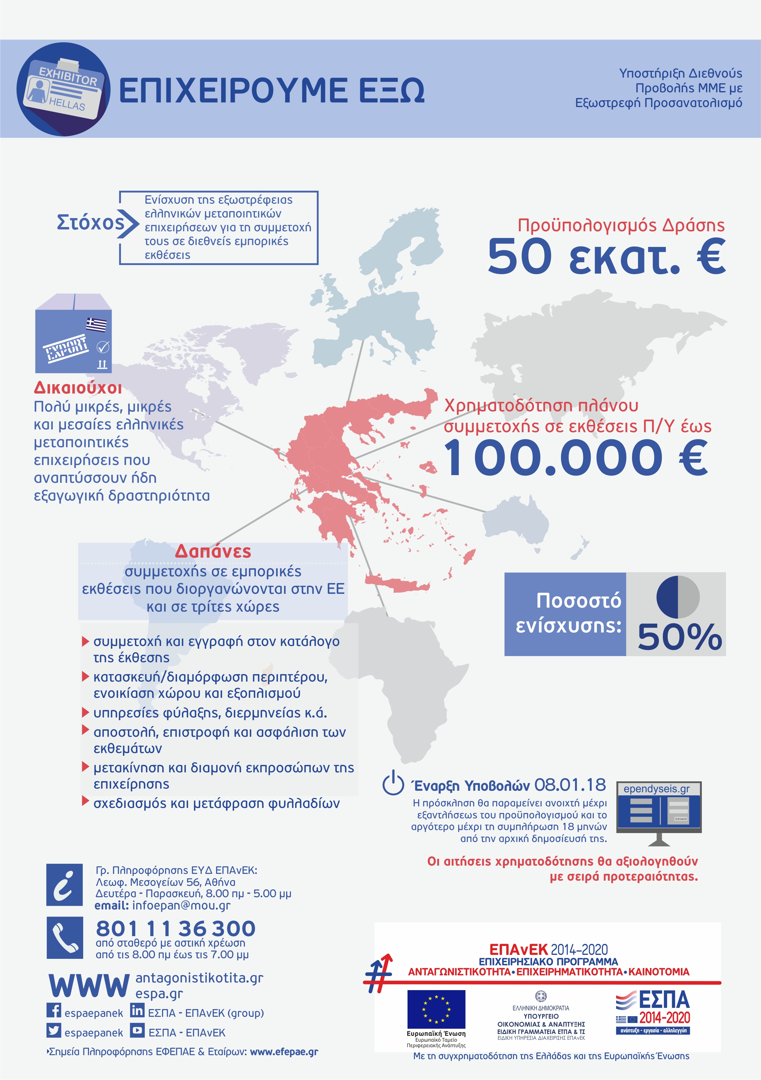 - Μέχρι 50.000 ευρώ ανά έκθεση στις περιπτώσεις συμμετοχής με περίπτερο άνω των 50 τμ, με ανώτατο ποσό δημόσιας επιχορήγησης 25.000 ευρώ